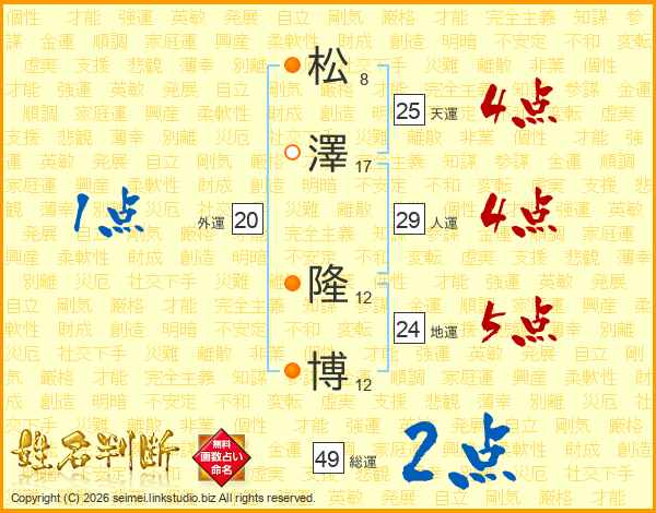 あなたの人生を表す1番重要な運勢です。生涯を通じて影響する総合運となり、主に50歳以降の晩年期に影響を及ぼします。苗字と名前の合計画数。
