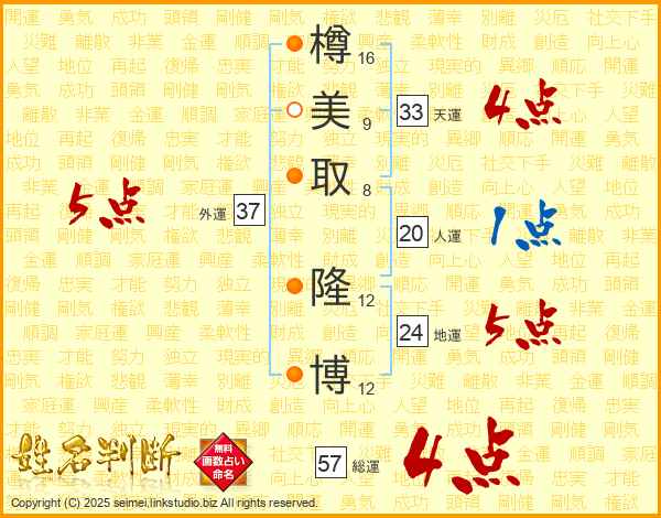 樽(16画)美(9画)取(8画) 隆(12画)博(12画)