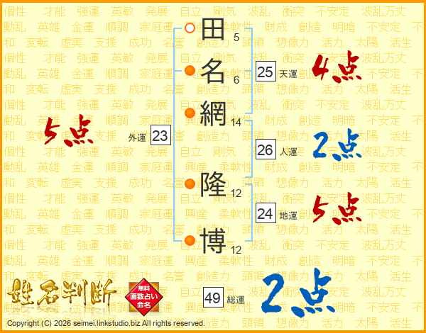 田(5画)名(6画)網(14画) 隆(12画)博(12画)