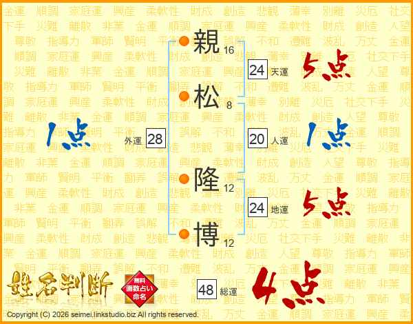 あなたの人生を表す1番重要な運勢です。生涯を通じて影響する総合運となり、主に50歳以降の晩年期に影響を及ぼします。苗字と名前の合計画数。