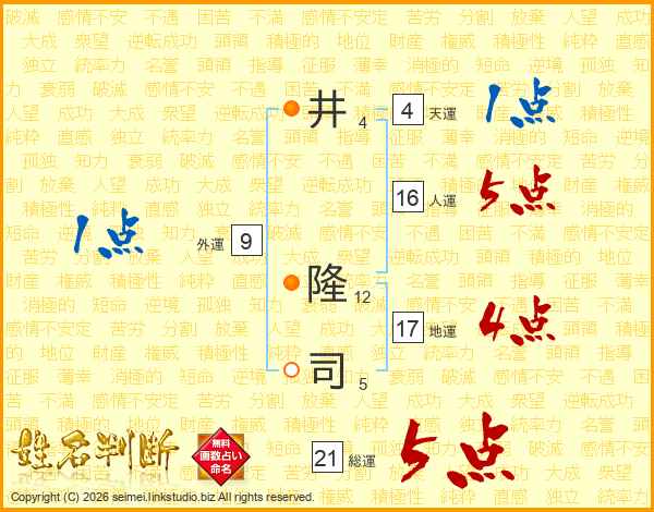 あなたの人生を表す1番重要な運勢です。生涯を通じて影響する総合運となり、主に50歳以降の晩年期に影響を及ぼします。苗字と名前の合計画数。