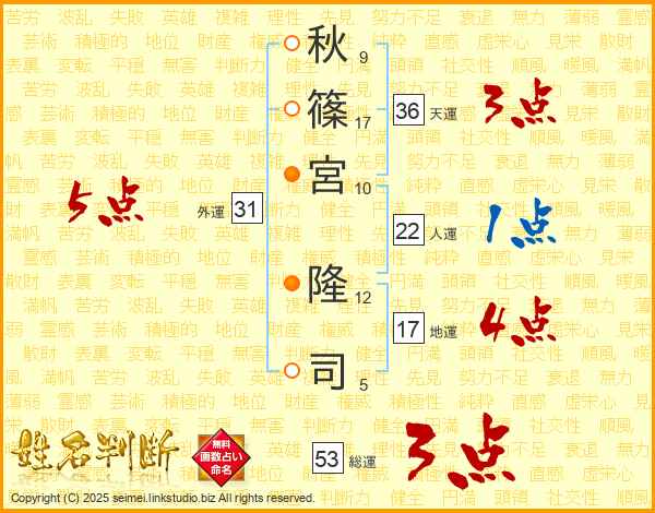 秋(9画)篠(17画)宮(10画) 隆(12画)司(5画)