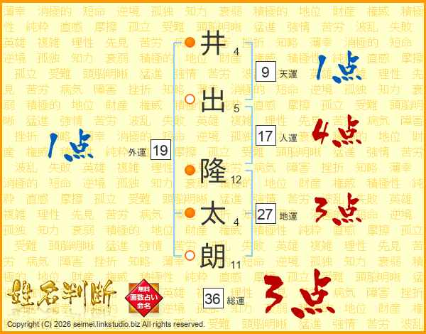 井(4画)出(5画) 隆(12画)太(4画)朗(11画)