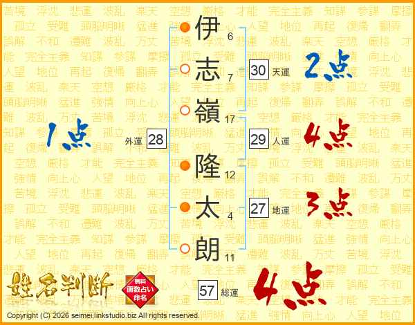 伊(6画)志(7画)嶺(17画) 隆(12画)太(4画)朗(11画)