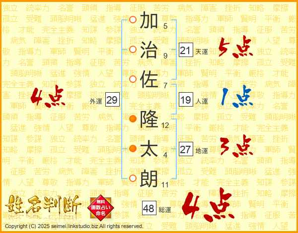 加(5画)治(9画)佐(7画) 隆(12画)太(4画)朗(11画)