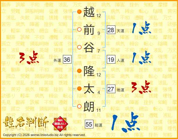 越(12画)前(9画)谷(7画) 隆(12画)太(4画)朗(11画)