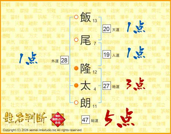 飯(13画)尾(7画) 隆(12画)太(4画)朗(11画)