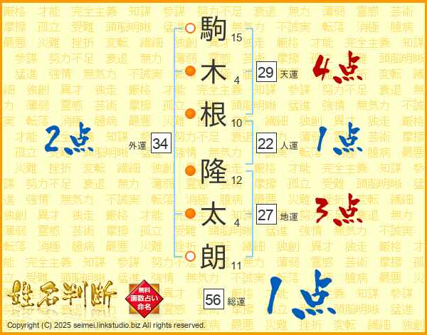 駒(15画)木(4画)根(10画) 隆(12画)太(4画)朗(11画)