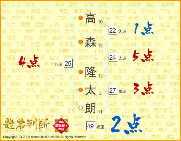 高(10画)森(12画) 隆(12画)太(4画)朗(11画)