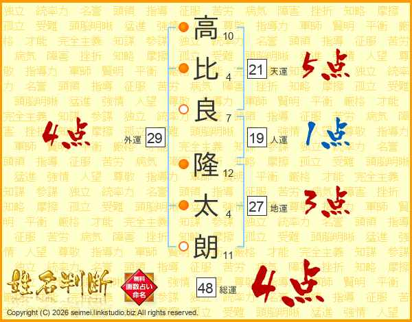 高(10画)比(4画)良(7画) 隆(12画)太(4画)朗(11画)