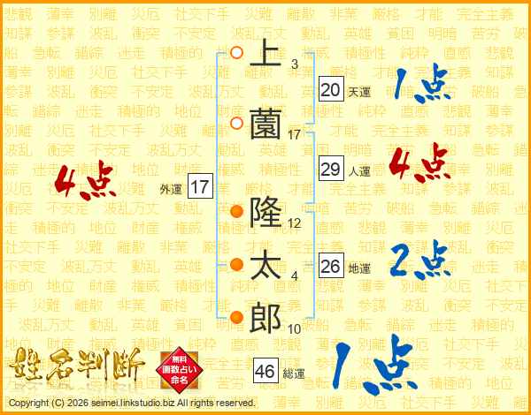 上(3画)薗(17画) 隆(12画)太(4画)郎(10画)