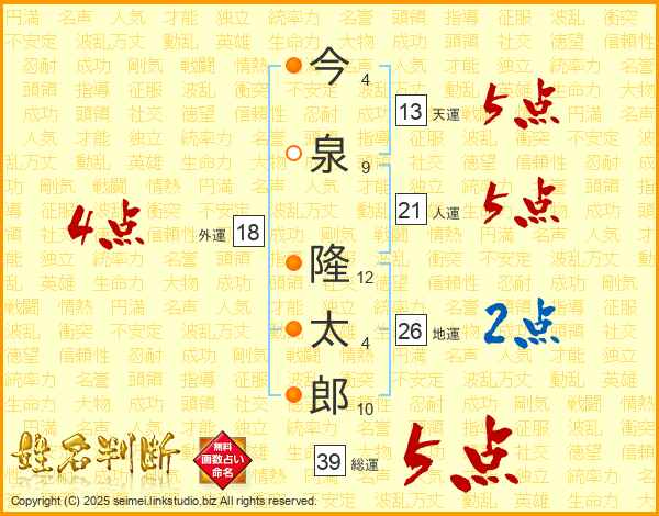 今(4画)泉(9画) 隆(12画)太(4画)郎(10画)
