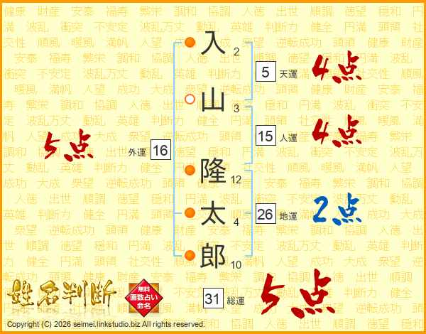 入(2画)山(3画) 隆(12画)太(4画)郎(10画)