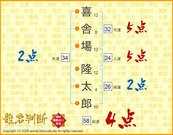 喜(12画)舎(8画)場(12画) 隆(12画)太(4画)郎(10画)