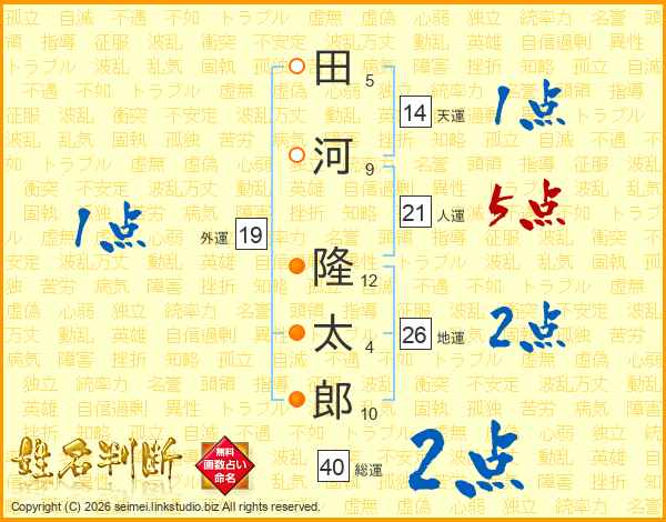 田(5画)河(9画) 隆(12画)太(4画)郎(10画)