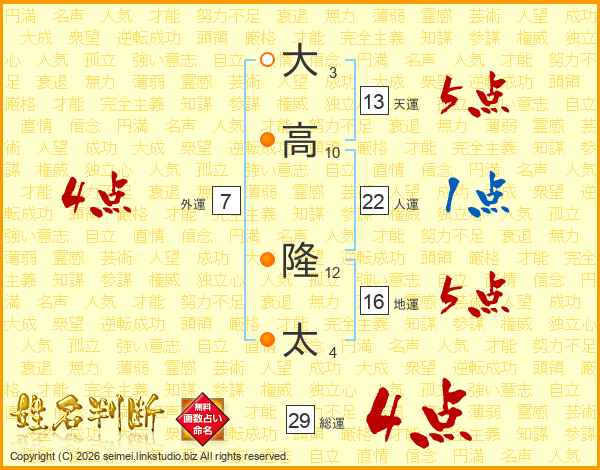 大(3画)高(10画) 隆(12画)太(4画)