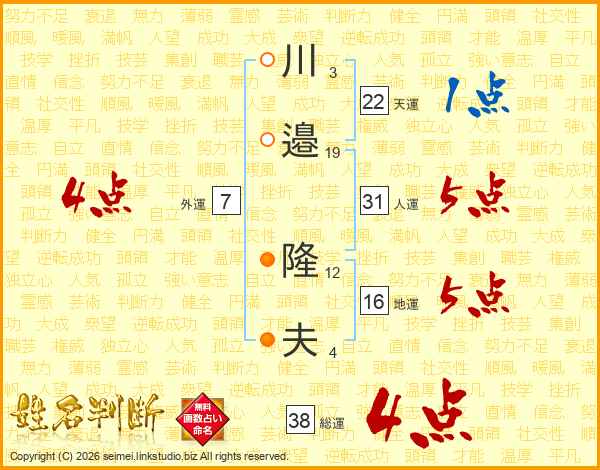 川(3画)邉(19画) 隆(12画)夫(4画)
