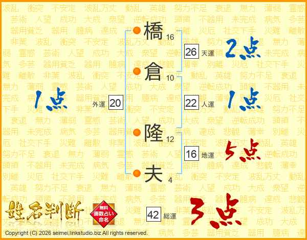 橋(16画)倉(10画) 隆(12画)夫(4画)