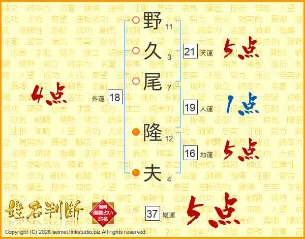 野(11画)久(3画)尾(7画) 隆(12画)夫(4画)