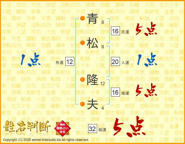 あなたの人生を表す1番重要な運勢です。生涯を通じて影響する総合運となり、主に50歳以降の晩年期に影響を及ぼします。苗字と名前の合計画数。