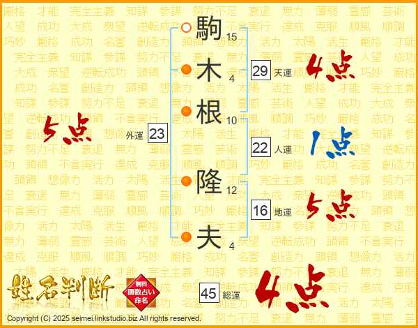 駒(15画)木(4画)根(10画) 隆(12画)夫(4画)