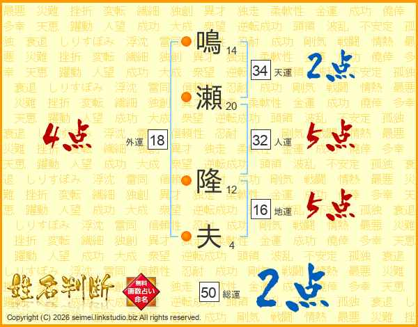 鳴(14画)瀬(20画) 隆(12画)夫(4画)