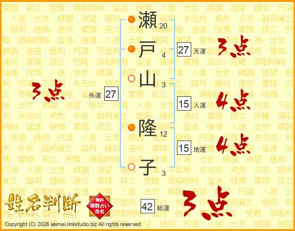 瀬(20画)戸(4画)山(3画) 隆(12画)子(3画)