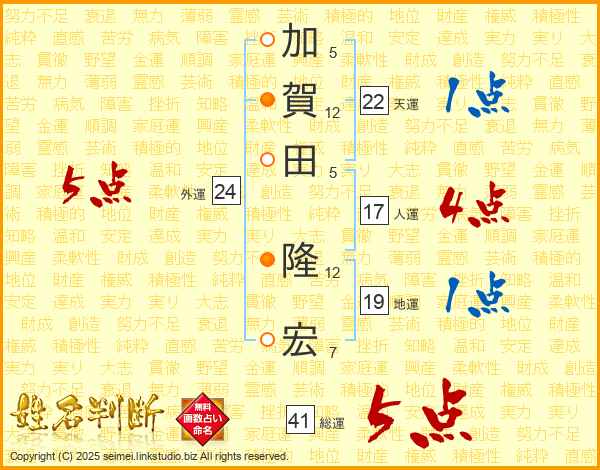 加(5画)賀(12画)田(5画) 隆(12画)宏(7画)