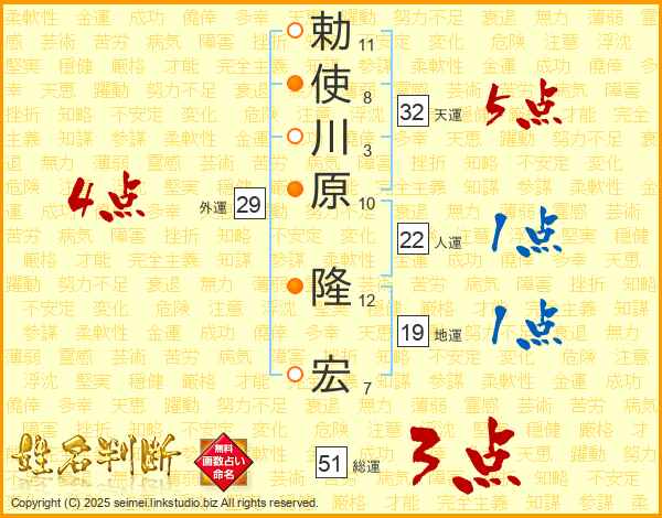 勅(11画)使(8画)川(3画)原(10画) 隆(12画)宏(7画)
