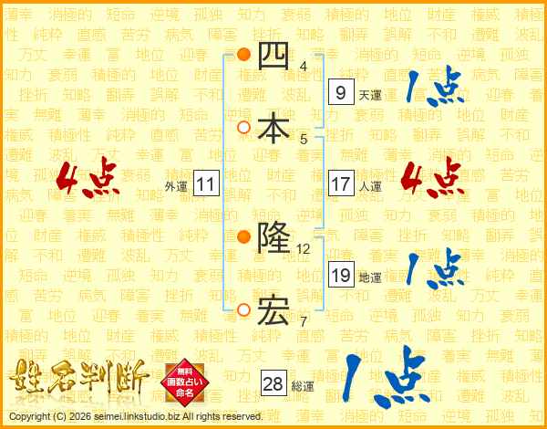 四(4画)本(5画) 隆(12画)宏(7画)