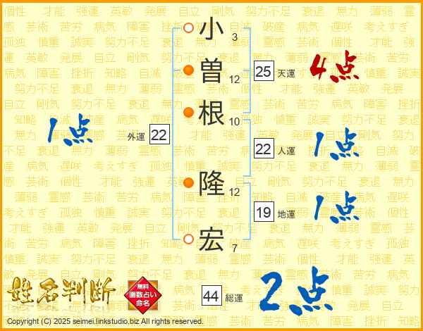 小(3画)曽(12画)根(10画) 隆(12画)宏(7画)