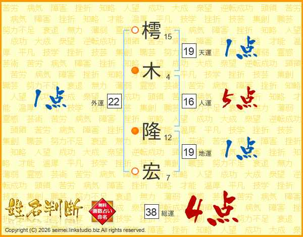 樗(15画)木(4画) 隆(12画)宏(7画)
