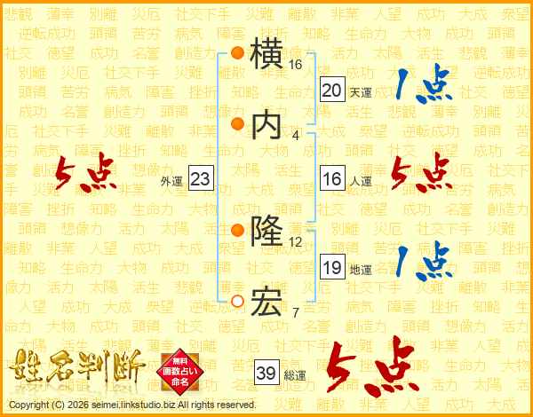 生活面を象徴する運勢です。外部から受ける影響力を表し、結婚運、家庭運や職場、環境への順応性を表します。総運から人運を引いた画数。姓や名が1文字の場合を除く。