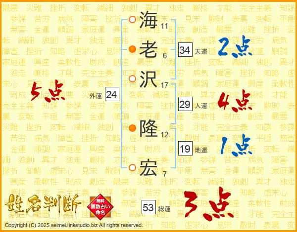 海(11画)老(6画)沢(17画) 隆(12画)宏(7画)