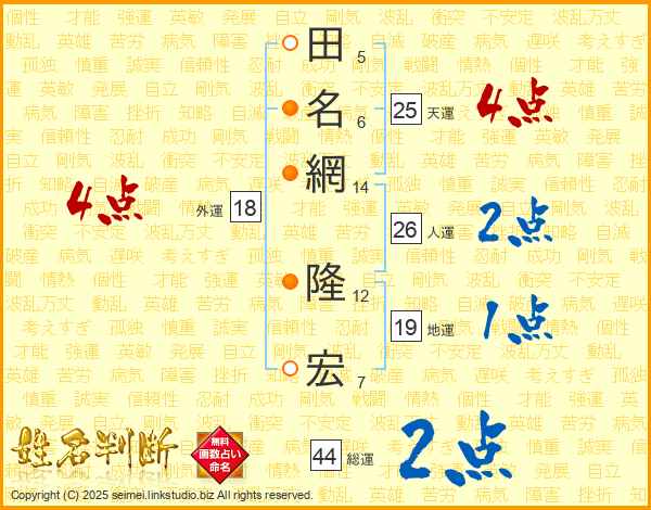 田(5画)名(6画)網(14画) 隆(12画)宏(7画)