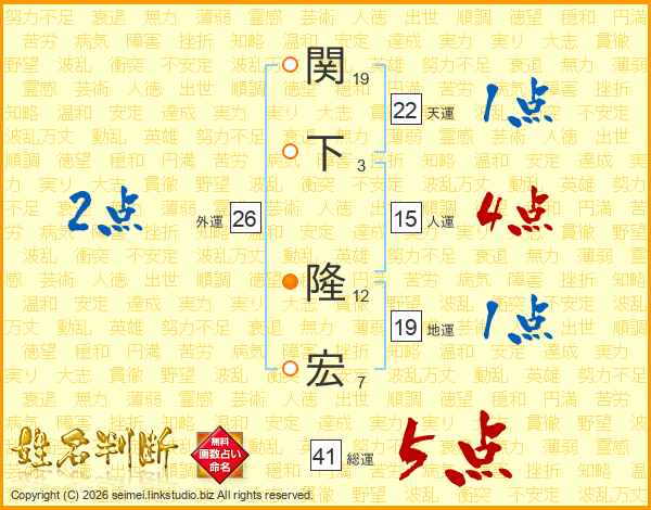 関下隆宏さんの総運は41画の5点!