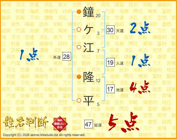鐘(20画)ケ(3画)江(7画) 隆(12画)平(5画)