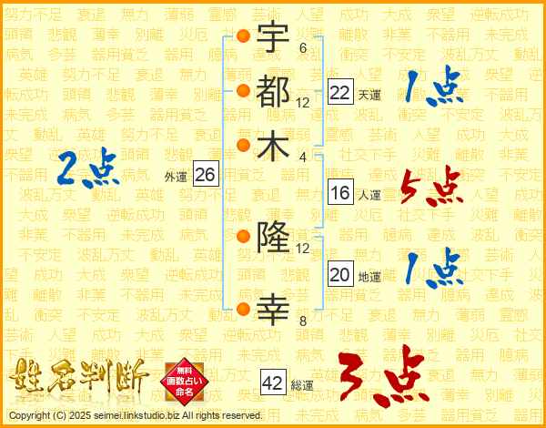 宇(6画)都(12画)木(4画) 隆(12画)幸(8画)