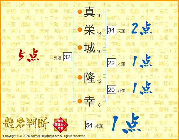真(10画)栄(14画)城(10画) 隆(12画)幸(8画)