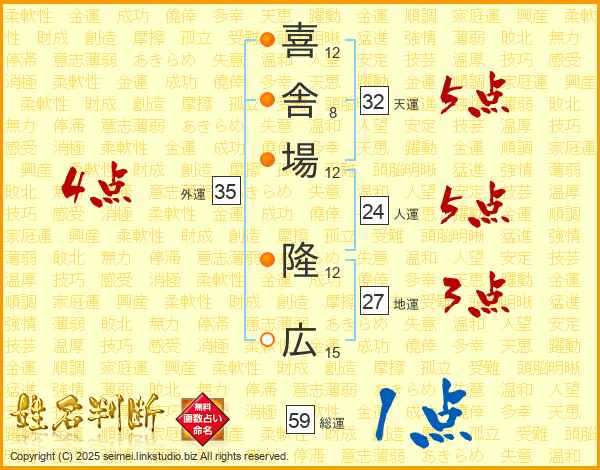 喜(12画)舎(8画)場(12画) 隆(12画)広(15画)