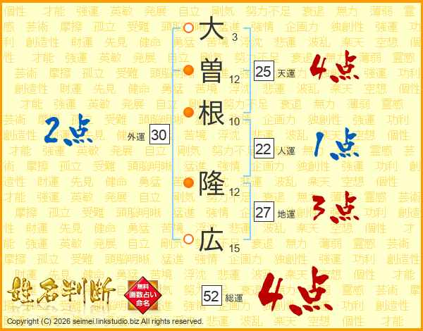 大(3画)曽(12画)根(10画) 隆(12画)広(15画)