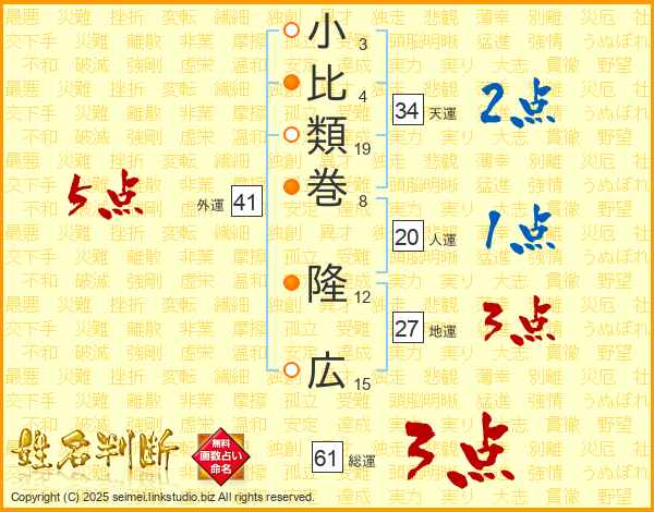 小(3画)比(4画)類(19画)巻(8画) 隆(12画)広(15画)