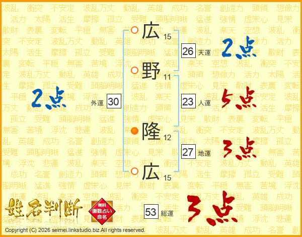 あなたの人生を表す1番重要な運勢です。生涯を通じて影響する総合運となり、主に50歳以降の晩年期に影響を及ぼします。苗字と名前の合計画数。