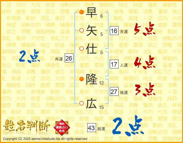 早(6画)矢(5画)仕(5画) 隆(12画)広(15画)