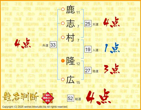 鹿(11画)志(7画)村(7画) 隆(12画)広(15画)