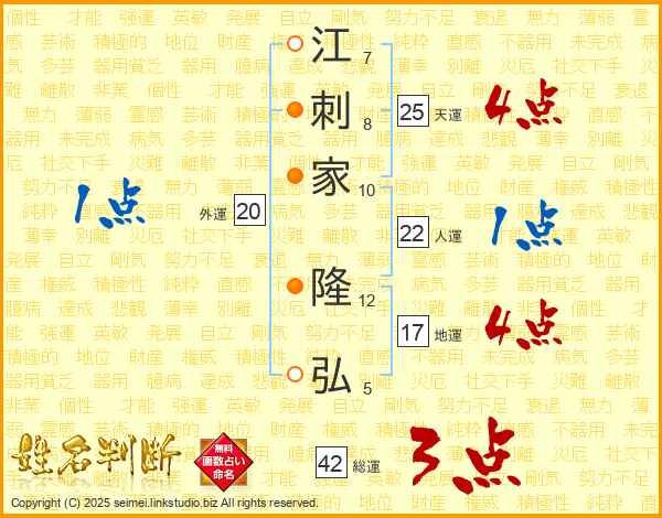 生活面を象徴する運勢です。外部から受ける影響力を表し、結婚運、家庭運や職場、環境への順応性を表します。総運から人運を引いた画数。姓や名が1文字の場合を除く。