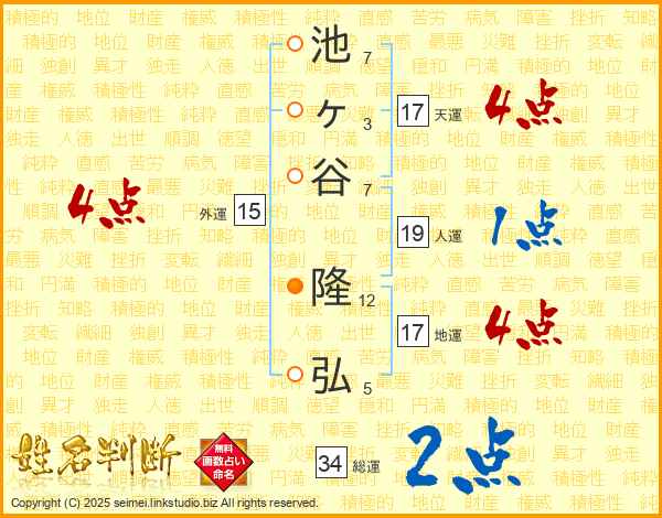 池(7画)ヶ(3画)谷(7画) 隆(12画)弘(5画)