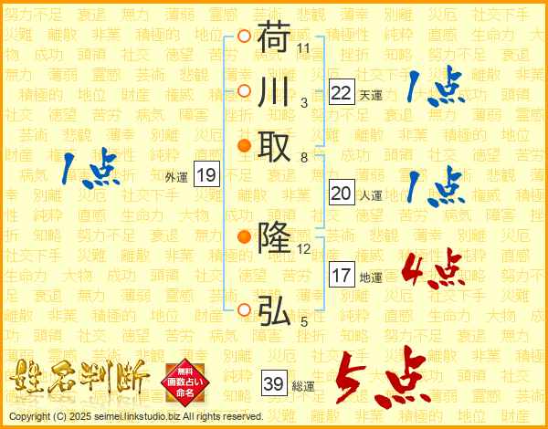 荷(11画)川(3画)取(8画) 隆(12画)弘(5画)