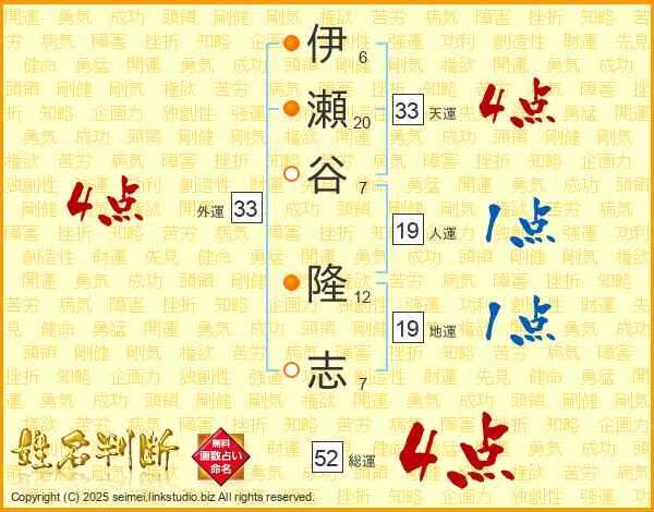 伊(6画)瀬(20画)谷(7画) 隆(12画)志(7画)