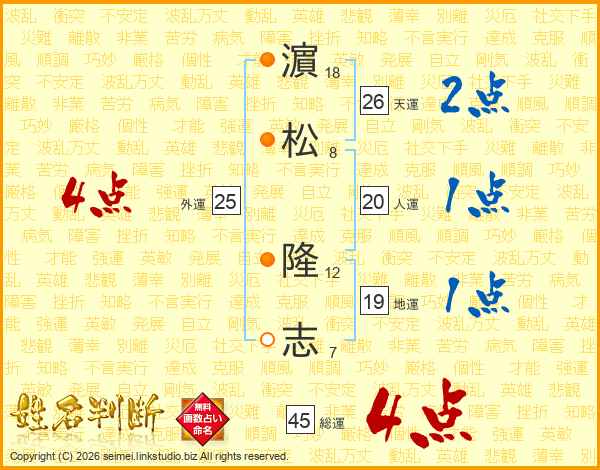 あなたの人生を表す1番重要な運勢です。生涯を通じて影響する総合運となり、主に50歳以降の晩年期に影響を及ぼします。苗字と名前の合計画数。